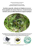 Condition corporelle, utilisation de l'habitat et structure d'une population de tortues d'Hermann, (Testudo hermanni hermanni), dans un milieu bénéficiant d'apports hydriques Les populations de tortues d'Hermann (Testudo hermanni hermanni) déclinent sur l'ensemble de leur aire de répartition. Dans le cadre du programme européen LIFE+, des points d'eau ont été créés sur un site doté d'une mare temporaire, constituant ainsi une ressource hydrique estivale. La SOPTOM-CRCC a pour objectif d’évaluer l’effet de cet aménagement dans le but de la création d'outils pour les gestionnaires d'espaces naturels en Europe. Dans ce rapport, j’ai évalué l’effet de la présence de ressources hydriques sur :