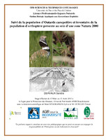 Suivi de la population d’Outarde canepetière et inventaire de la population d’orthoptère présente au sein d’une zone Natura 2000 Devant l’intensification de l’agriculture d’après guerre, la disparition de nombreux milieux pérennes a été constatée. Ce qui fût la cause de nombreuses disparitions d’espèces affiliées aux plaines cultivées. C’est dans ce contexte que certaines espèces résistent telle que l’Outarde Canepetière Tetrax tetrax. Des mesures de protection ont été mise en place comme La ZPS « Champagne de Méron » localisée à Montreuil-Bellay en Maine et Loire qui accueille une petite population de cette espèce lors de la saison de reproduction. Un suivi annuel est effectué afin d’en surveiller l’évolution. Cette année en complément, une étude entomologique fut effectuée particulièrement sur un échantillon de parcelles sous contrat MAE. Les résultats présentés sont sur la population d’orthoptères. Une comparaison des parcelles est faite par l’utilisation des indices de biodiversité reliés à l’âge des parcelles MAE et aux contrats les concernant. Les résultats montrent qu’il existe une influence des contrats contracté sur les parcelles sur la